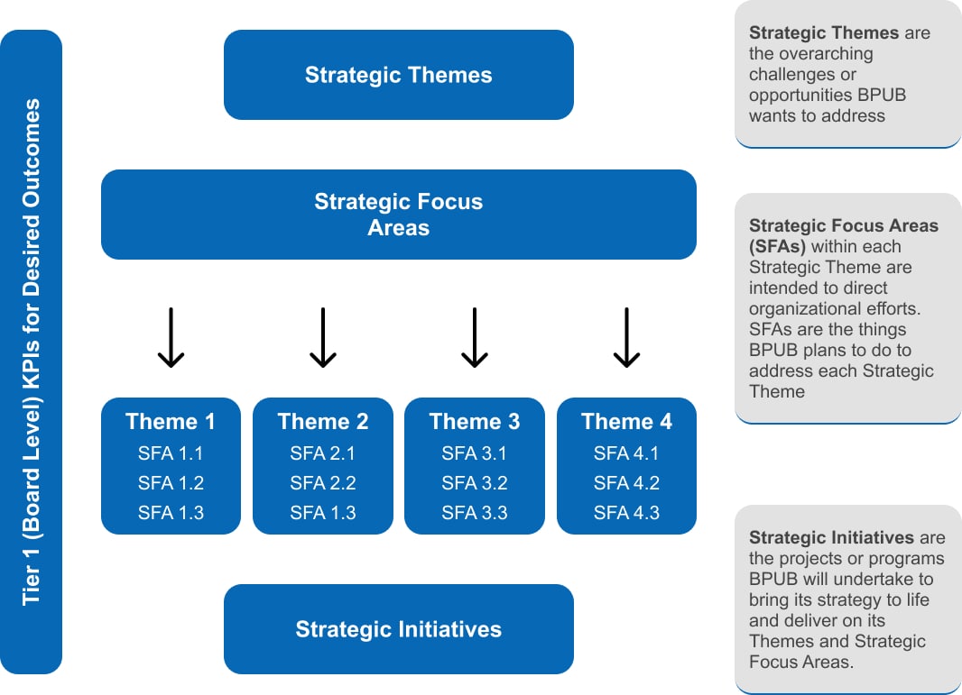 Historically, BPUB has followed a 5-year strategic planning cycle. For the 2026-2030 Strategic Plan (The Plan), BPUB has developed a comprehensive five-year strategic plan that unifies the ten (10) subordinate departmental business plans under a single framework. The Plan aims to establish clear strategic outcomes and key performance indicators (KPIs) to enhance operational efficiency, address future challenges, and drive sustainable growth.